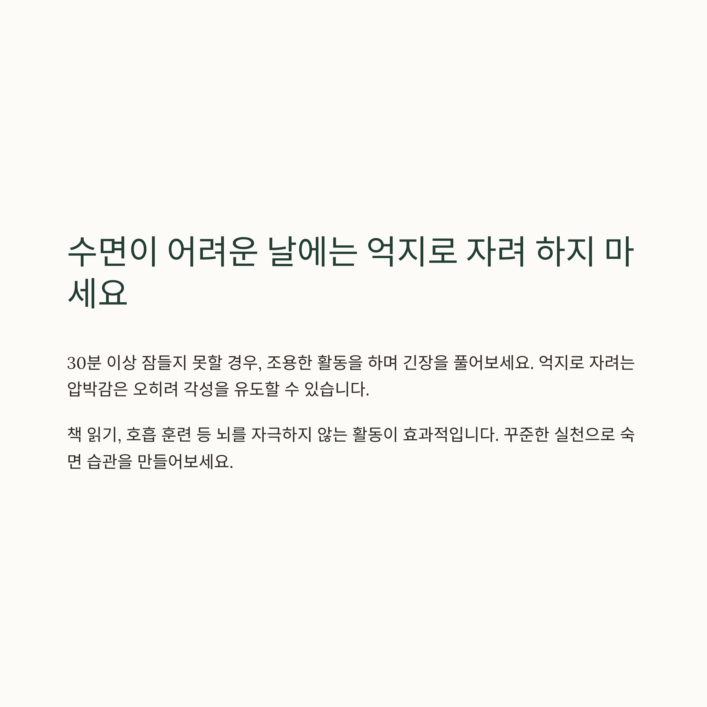 억지로 자려는 압박감은 오히려 각성을 유도할 수 있습니다.