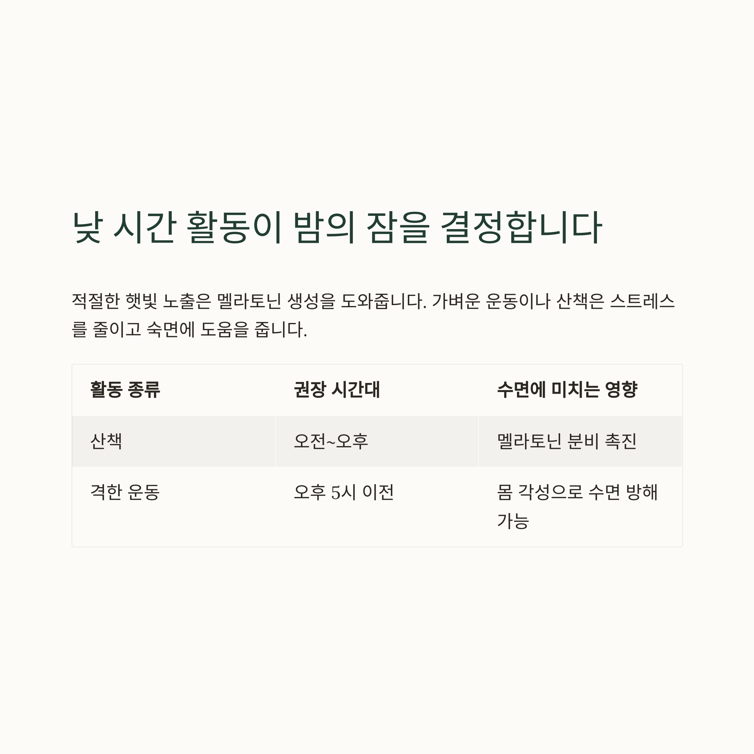 활동 종류 | 권장 시간대 | 수면에 미치는 영향 |