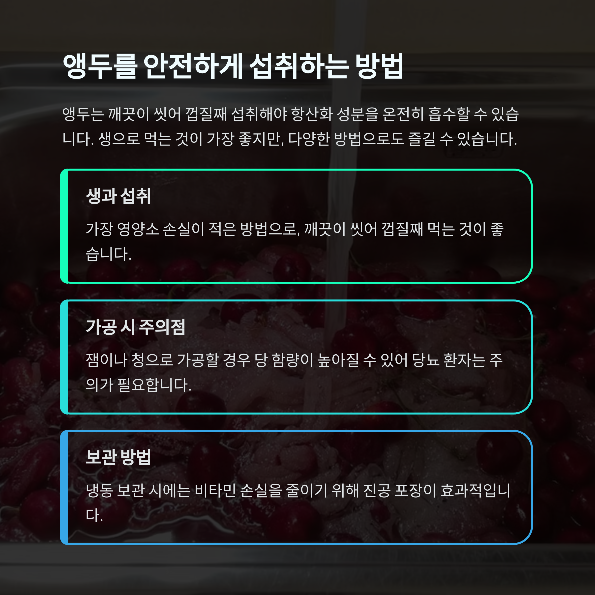 앵두는 계절성 과일이기 때문에 제철(5~6월)에생과로 섭취하는 것이 가장 영양소 흡수에 좋습니다.